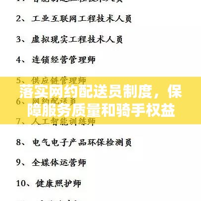 隨著互聯(lián)網(wǎng)的普及和電子商務(wù)的飛速發(fā)展,網(wǎng)絡(luò)訂餐、購物等服務(wù)日益便捷,網(wǎng)約配送員作為連接線上線下的重要紐帶,其數(shù)量迅速增長,如何落實(shí)網(wǎng)約配送員制度,確保服務(wù)質(zhì)量和人員權(quán)益,成為業(yè)界關(guān)注的焦點(diǎn),本文將從多個方面探討落實(shí)網(wǎng)約配送員制度的必要性及其實(shí)施策略。